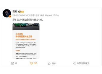 小米购置税补贴今晚结束:最高补1.5万元2025/12/1 8:43:00