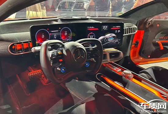 内饰方面,AMG GT XX Concept以科技氛围为核心,贯穿式双联屏集成大部分行车与娱乐信息。方向盘采用近似蝴蝶式的结构,两侧布置旋钮与实体按键,便于在激烈工况中操作。中控饰板与出风口均围绕“弧形大嘴”设计展开呼应,配合橙色点缀,使整体观感更具识别度。